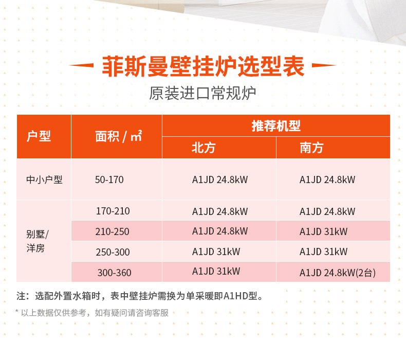 菲斯曼A1JF/A1HF系列:此款壁挂炉为新推出的型号,为采暖和生活热水两用炉。功率只有18KW-22KW,适用于采暖面积100-120平方以内的房型。产品特点是性价比高。